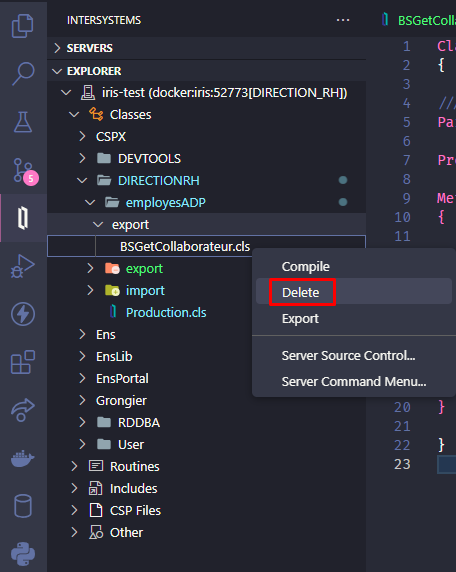 Normalement lorsque je vais dans l'extension InterSytems, j'ouvre mes classes dans mon namespace et lorsque je faisais clique droit > delete, les fichiers se supprimaient. Cependant, ce n'est plus le cas, lorsque je clique sur delete rien ne se passe