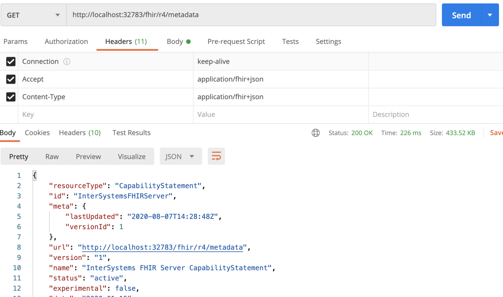 Appel GET des métadonnées des ressources fhir pour http://localhost:32783/fhir/r4/metadata