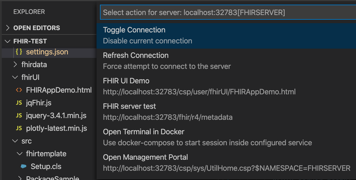 l'application de l'interface très basique avec des appels de recherche et d'obtention aux ressources FHIR Patient et Observation peut être trouvée ici : http://localhost:32783/fhirUI/FHIRAppDemo.html ou à partir du menu VSCode ObjectScript :