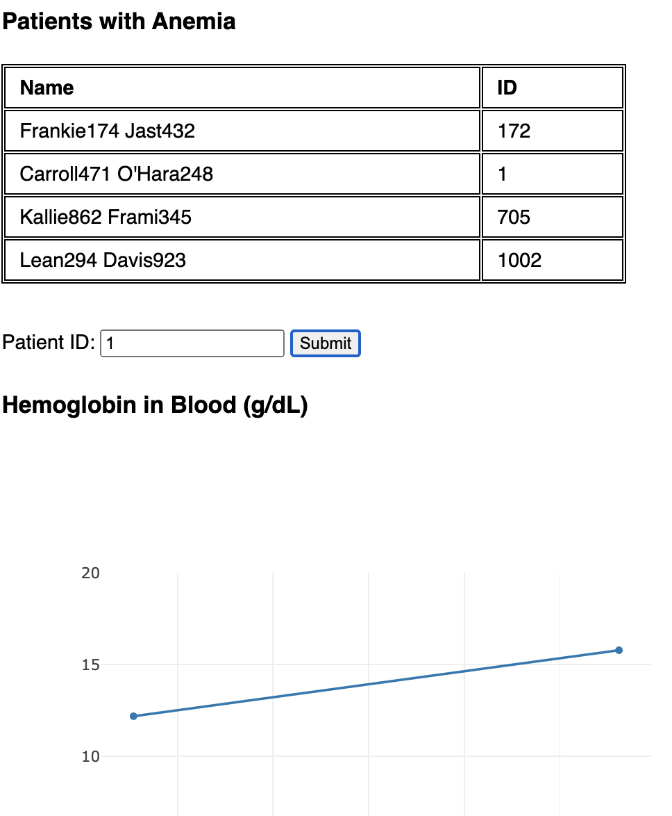 En ouvrant la page, les résultats de la recherche de patientes anémiques s'affichent ainsi que les graphiques des valeurs d'hémoglobine d'une patiente sélectionnée :