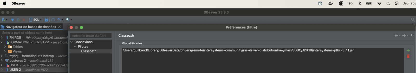 Next, we'll need to tell the IRIS JDBC driver how to find this keystore, which is accomplished through an SSLConfig.properties file. This simple text file needs to be placed in the working directory of the Java program that'll open the JDBC connection. On Windows, that's %LOCALAPPDATA%\DBeaver, which translates to C:\Users\<you>\AppData\Local\DBeaver. On Mac, it's typically /Applications/DBeaverEE.app/Contents/MacOS. As an alternative, you can also create the file elsewhere and set the full path as an environment variable named com.intersystems.SSLConfigFile.