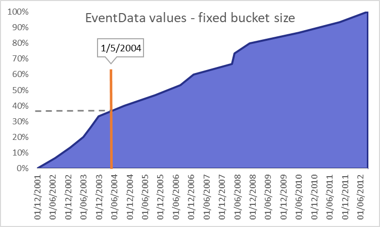 Voici une autre façon de visualiser notre utilisation des histogrammes, en les traçant comme un barre de distribution cumulative. Nous pouvons voir comment la ligne tracée pour le 1er mai 2004 sur l'axe X (les valeurs), se traduit par ~37% sur l'axe Y.