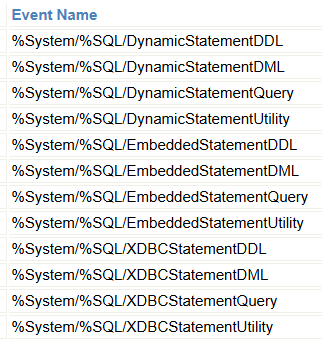 Auparavant, vous pouviez décider d'auditer les instructions SQL en fonction du mécanisme d'accès, par exemple en exécutant des instructions à partir de JDBC/ODBC par rapport à l'Embedded SQL (par exemple en utilisant &sql dans votre code) par rapport au Dynamic SQL (par exemple en utilisant %SQL.Statement dans le code, ou par exemple en utilisant l'exécution de requête SQL du portail de gestion, ou à partir du shell SQL dans le terminal), et maintenant, en plus de cela, vous pouvez décider d'auditer uniquement certains types d'instructions (par le mécanisme d'accès, comme cela était possible auparavant). Ces types sont :