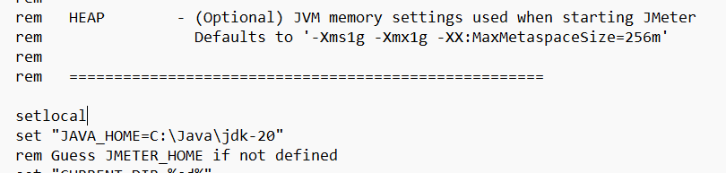 - Modifiez le fichier jmeter.bat (pour Windows) ou jmeter.sh (pour les autres systèmes d'exploitation) et ajoutez le JAVA_HOME (dans mon cas C:\Java\jdk-20) après la ligne setlocal :