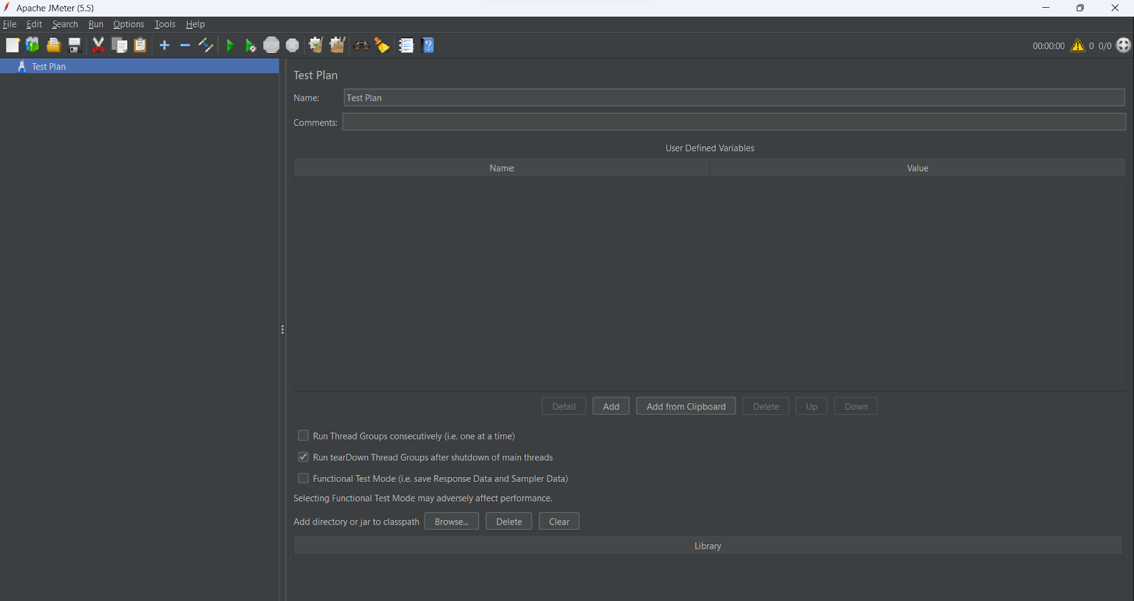 - Vous verrez que JMeter est prêt pour un nouveau plan de test à ce stade :