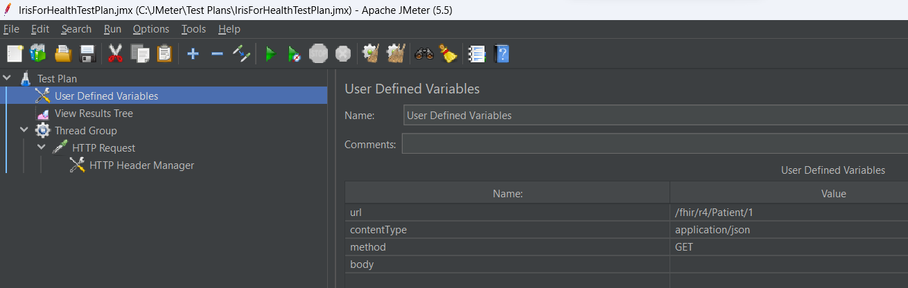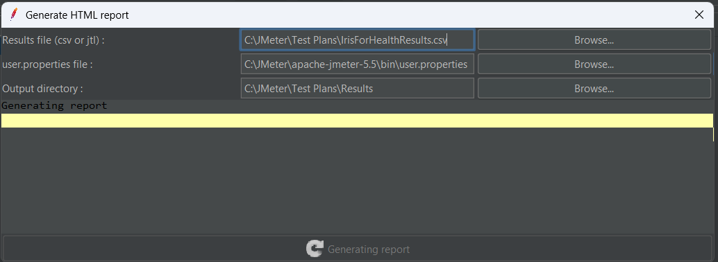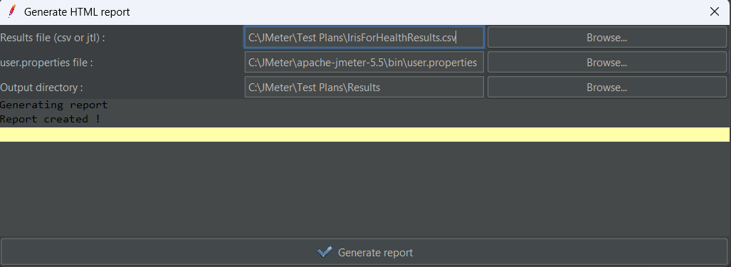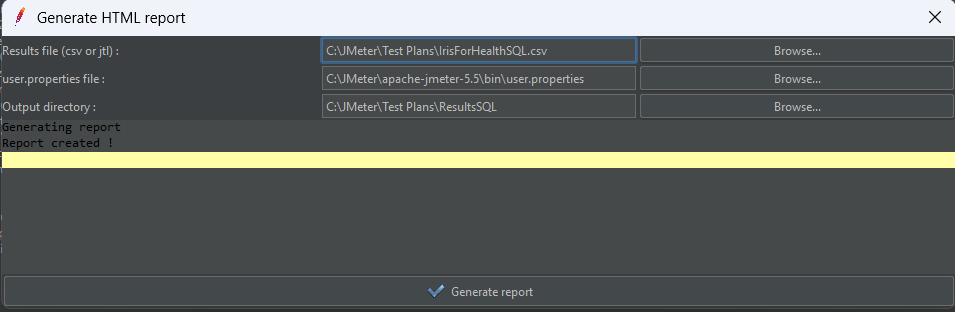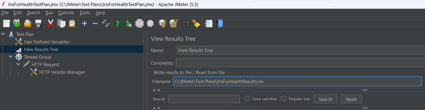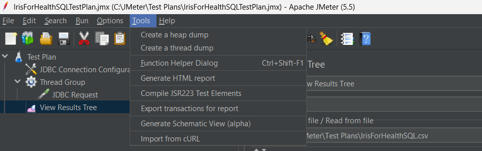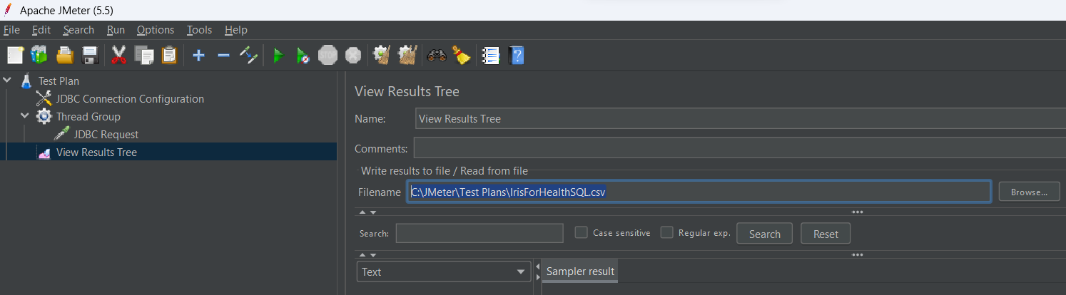 - Nom de fichier (tout nom de dossier et de fichier) : C:\JMeter\Test Plans\IrisForHealthSQL.csv