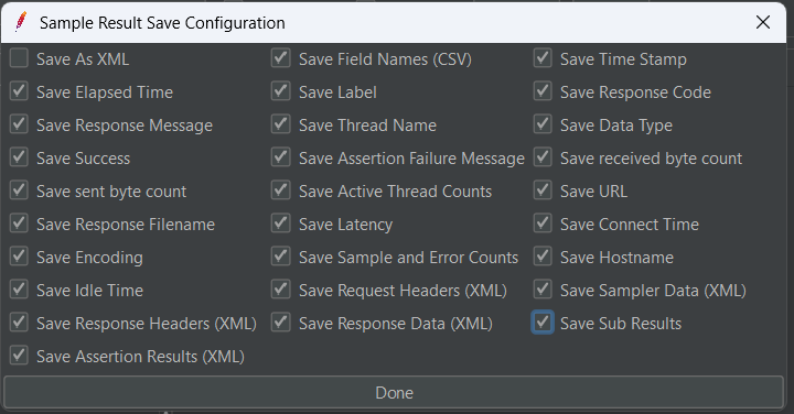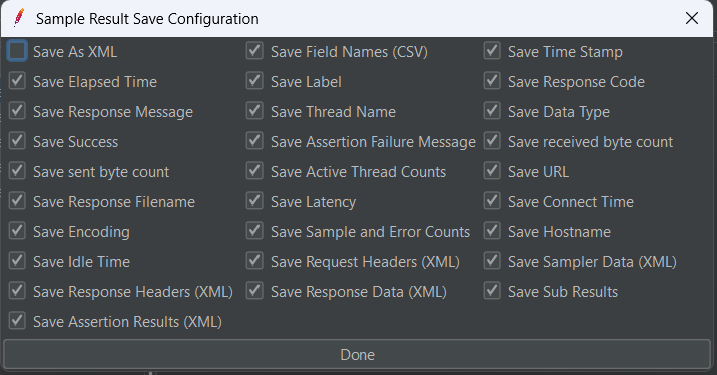 - Cliquez sur le bouton Configurer (Configure) et sélectionnez toutes les options à l'exception de Sauvegarder en tant que XML (Save as XML), puis cliquez sur le bouton Terminé (Done) :