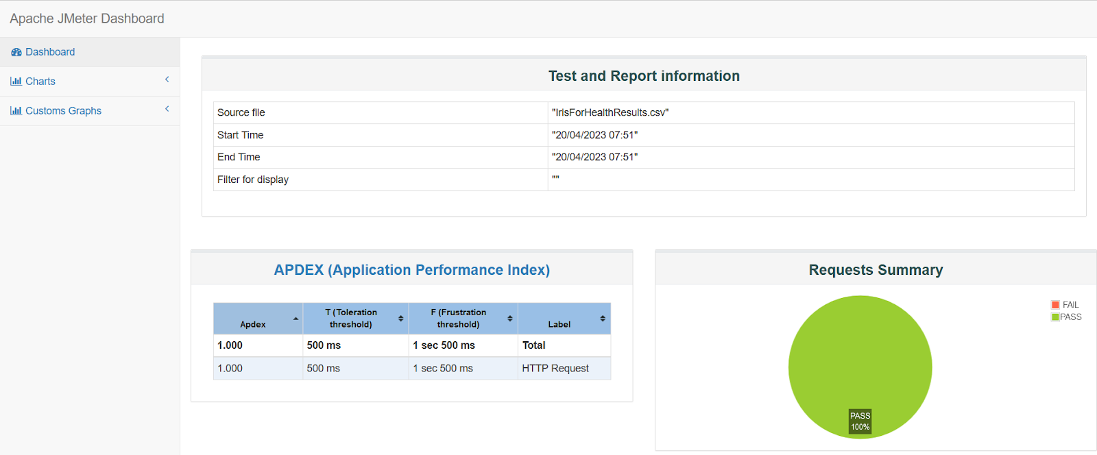 - Augmentez le nombre de fils, exécutez à nouveau le plan de test, générez à nouveau le rapport HTML Dashboard (n'oubliez pas de supprimer d'abord le contenu du dossier de sortie) et vérifiez l'index.html pour voir les résultats avec 100 utilisateurs simultanés :