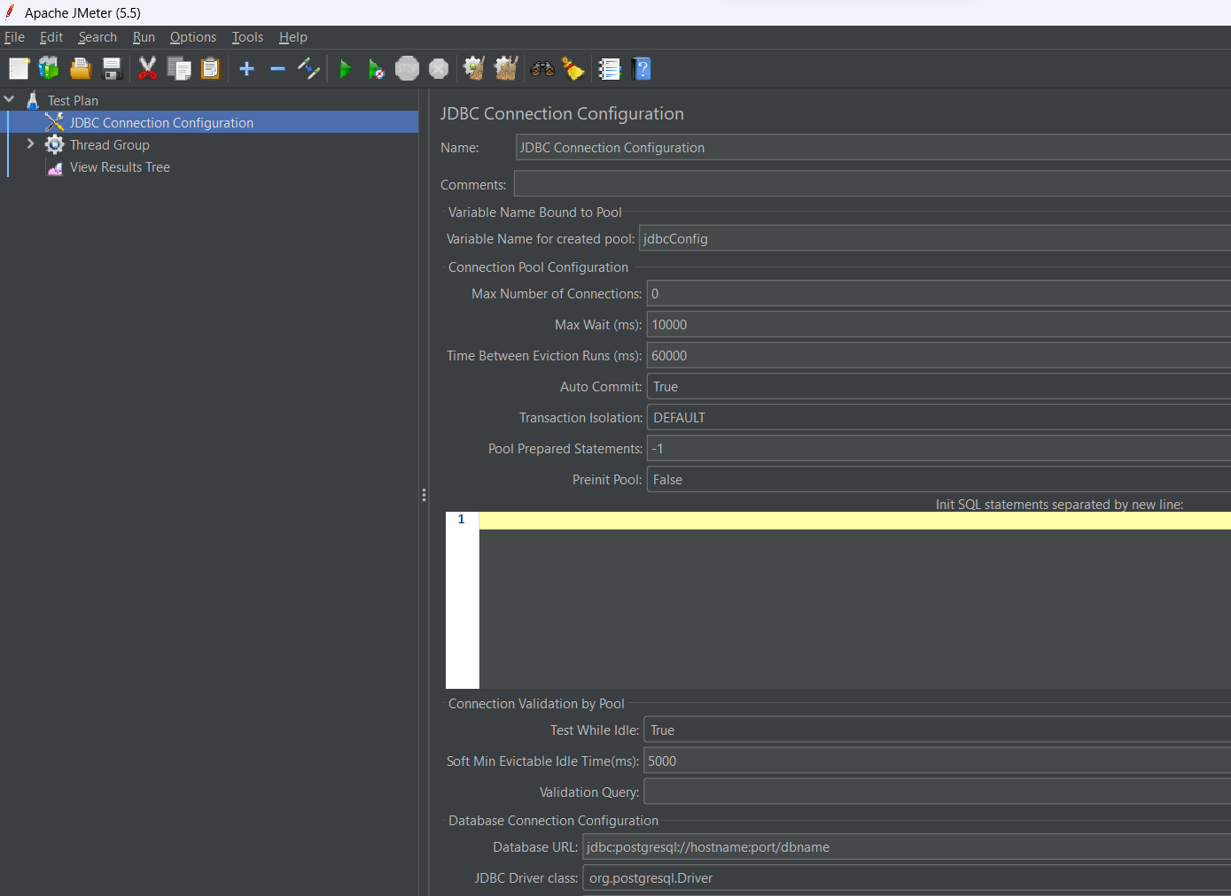 9. Sélectionnez la requête JDBC (JDBC Request) et définissez les propriétés suivantes :