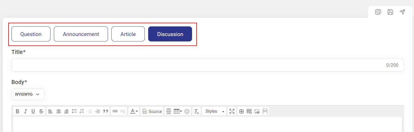 Ensuite, vous verrez apparaître l'éditeur qui vous donnera le choix de créer une Question, une Annonce, un Article, ou une Discussion. Les différents types de messages ont leurs propres ensembles de champs obligatoires et facultatifs.