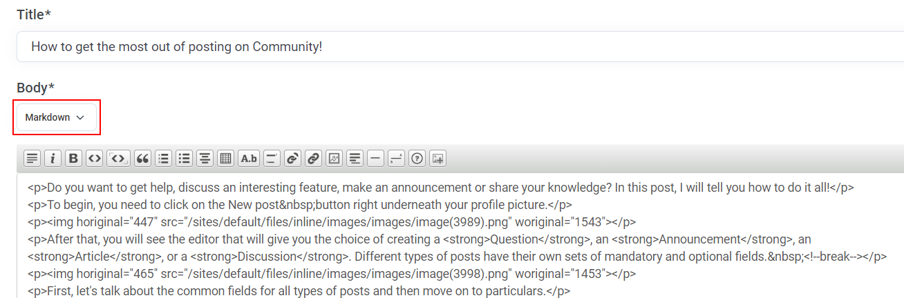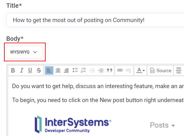Ensuite, dans le champ Corps, vous écrivez ce que vous voulez partager avec les autres. Vous avez le choix entre deux options pour rédiger le texte de votre post. Vous pouvez utiliser l'éditeur WYSIWYG ou Markdown. Bien entendu, le résultat sera le même dans les deux cas.