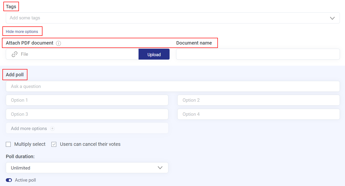 En principe, chaque message comporte un titre (Title*), un corps (Body*), un groupe (Group*), des balises et quelques options supplémentaires permettant d'ajouter un sondage ou de joindre un ou plusieurs fichiers PDF. Tous les champs de texte marqués d'un astérisque (*) sont obligatoires. Tout d'abord, vous devez choisir le type de message, par exemple, une Question, une Annonce, un Article ou une Discussion.