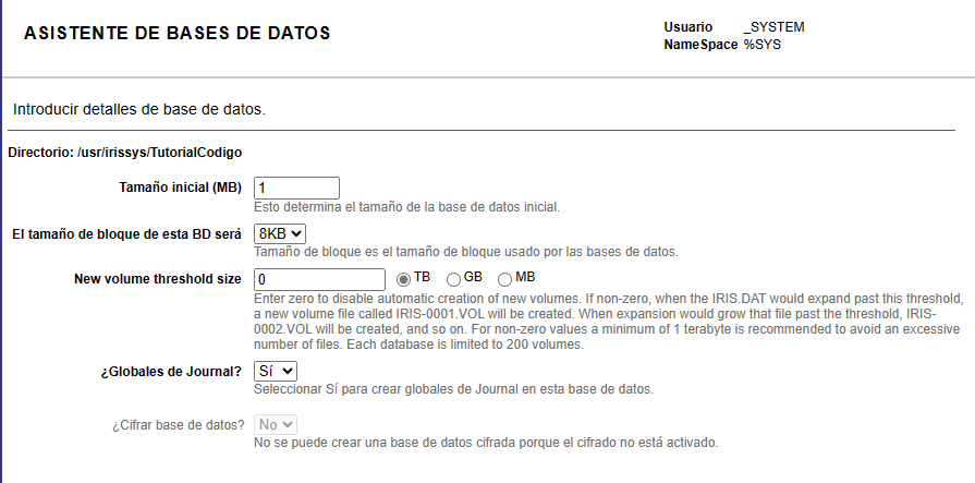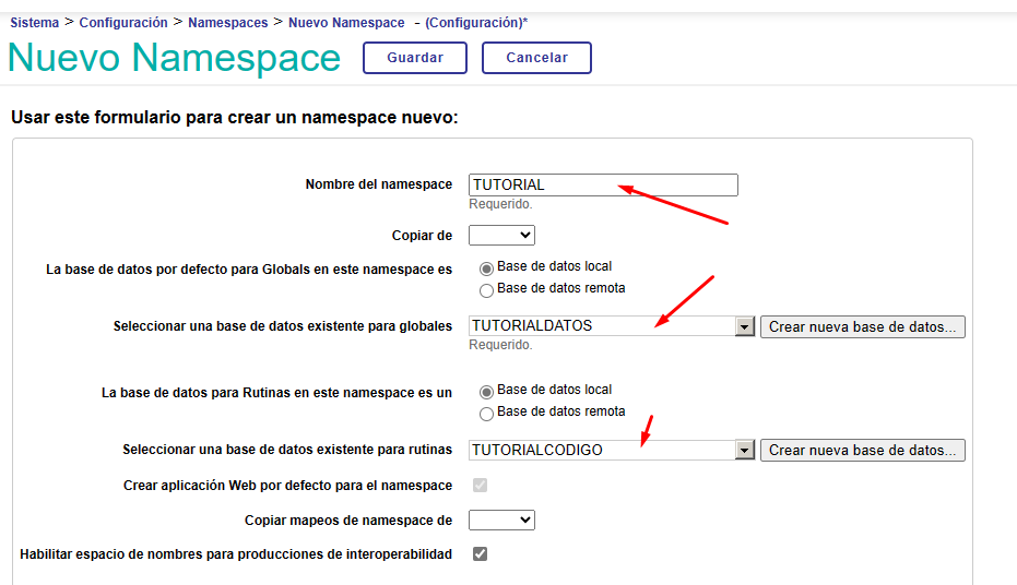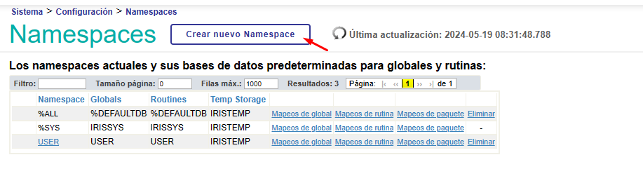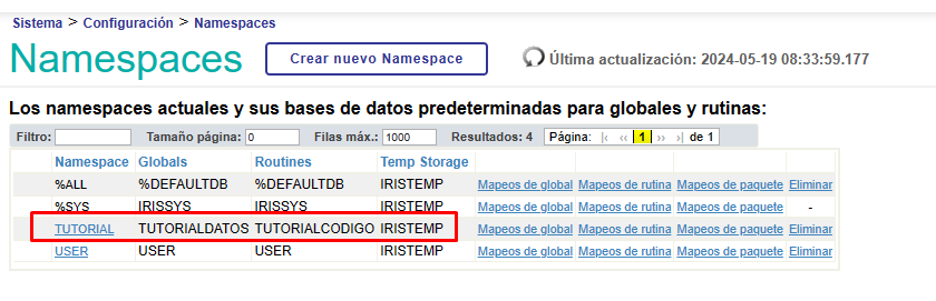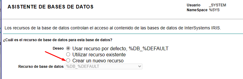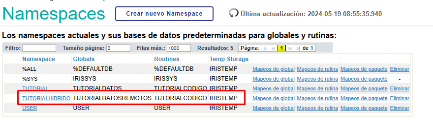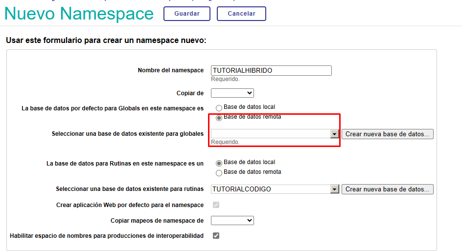 Nous accédons à la section Namespaces et cliquons sur le bouton "Créer un Namespace". Pourtant, cette fois dans la section Database pour les globales nous allons sélectionner l'option "Remote Database" et choisir la base de données distante que nous avons créée: