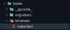 defhome(request):return render(request, “index.html”)Finalement, créez le fichier index.html. Il doit être ajouté au dossier books/templates. Consultez l'image ci-dessous à titre de référence :