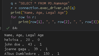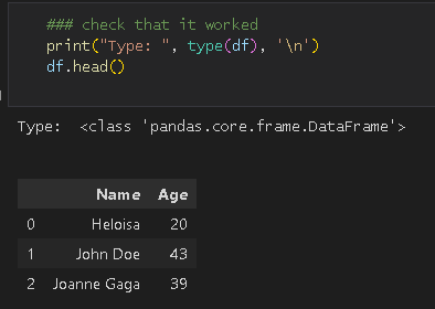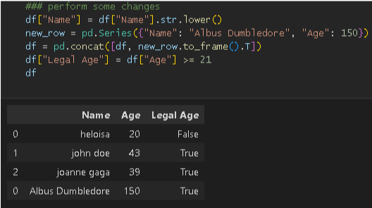 df = pd.read_sql_table("NameAge", connection, schema="PD")C'est une bonne pratique de vérifier si le tableau avec lequel nous travaillons existe dans le schéma que nous voulons utiliser et, bien sûr, s'il y a un schéma dont nous avons besoin au départ. Dans la dernière section de cet article, vous apprendrez comment le faire ainsi que quelques autres conseils. À partir de maintenant, si vous avez l'habitude d'utiliser Pandas, vous pouvez effectuer toutes les modifications et analyses que vous souhaitez puisque vous savez quoi faire. Explorez l'exemple suivant pour voir comment cela fonctionne.