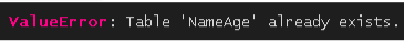 df.to_sql("NameAge", con=engine, schema="PD", if_exists="replace")Une fois de plus, nous devons placer le schéma dans un argument séparément du nom du tableau afin d'éviter certaines erreurs et un comportement indésirable. En outre, l'argument if_exists spécifie ce qu'il faut faire s'il existe déjà un tableau portant le même nom dans le schéma concerné. Les valeurs possibles sont : "replace" (remplacer), "fail" (échouer, la valeur par défaut) et "append" (ajouter). Bien entendu, l'option "replace" supprime le tableau et en crée un nouveau à l'aide d'une commande SQL, tandis que l'option "append" ajoute les données au tableau existant. N'oubliez pas que cette méthode ne vérifie pas les valeurs répétées ; soyez donc prudent lorsque vous utilisez cet attribut. Enfin, la valeur "fail" provoque l'erreur suivante :