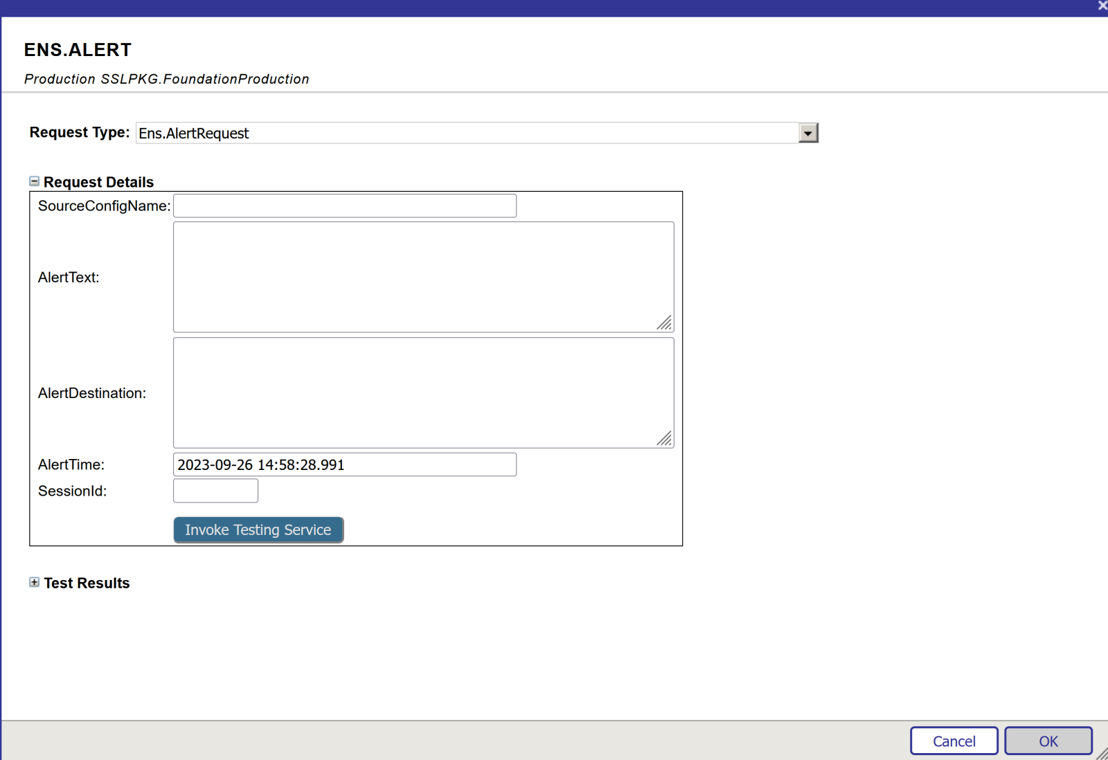 - Dans la fenêtre contextuelle, sélectionnez "Request Type" comme Ens.AlertRequest. Les champs SourceConfigName (qui apparaîtra dans l'en-tête de l'e-mail) et AlertText (qui apparaîtra dans le corps de l'e-mail) sont obligatoires et les autres champs sont facultatifs.