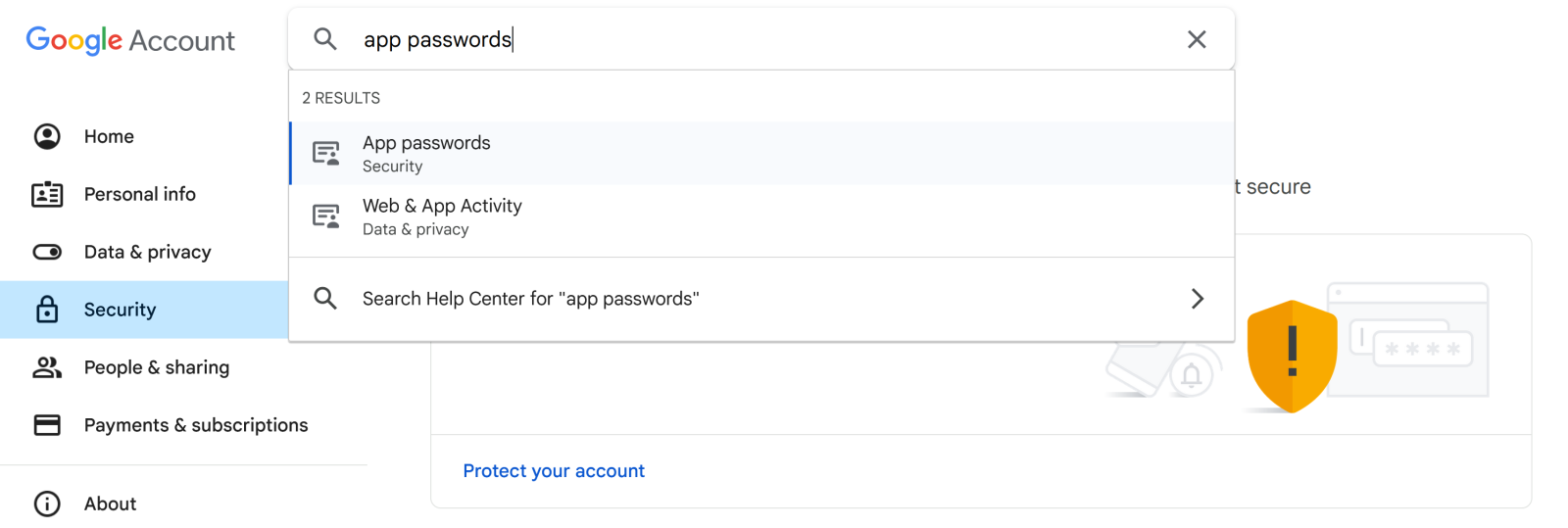 - Dans "Comptes et importation", allez dans "Autres paramètres du compte Google". Activez l'authentification à deux facteurs, puis dans la barre de recherche, trouvez "App passwords" :