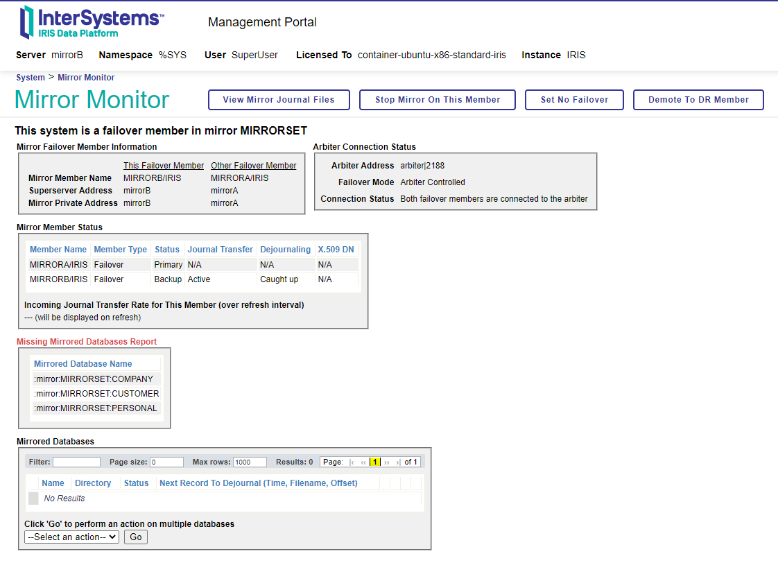 Nous enregistrons la configuration comme nous l'avons indiqué et nous retournons au moniteur du miroir pour vérifier que nous avons tout configuré correctement. Nous pouvons visualiser le moniteur du nœud actif dans miroirA et du nœud passif dans miroirB. Examinons les différences entre les deux instances.