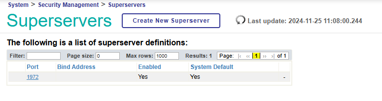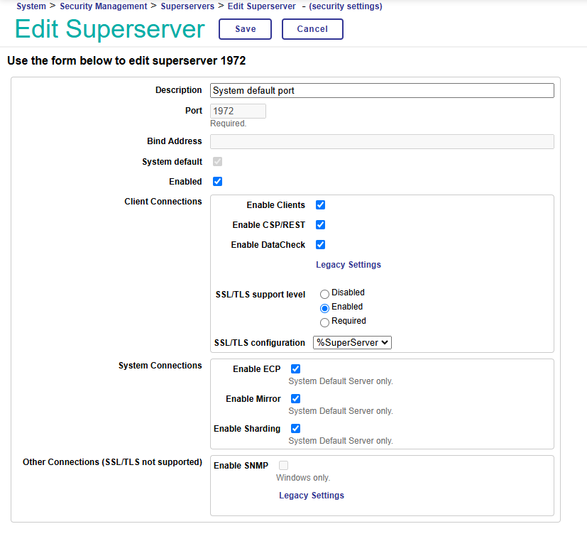 En sélectionnant le port 1972, nous pouvions voir les informations de sécurité et il nous suffisait d'activer les connexions SSL avec la configuration SSL/TLS %SuperServer précédemment créée :