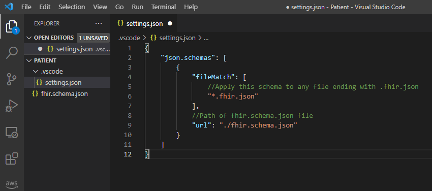Étape 3: Configurez le code VS pour reconnaître le schéma FHIR en modifiant le fichier setting.json.