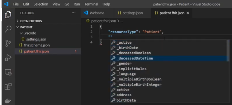 Création et validation de n'importe quelle ressource HL7 FHIR en utilisant le schéma FHIR à l'aide d'IntelliSense et de la fonctionnalité de complétion automatique dans VS Code