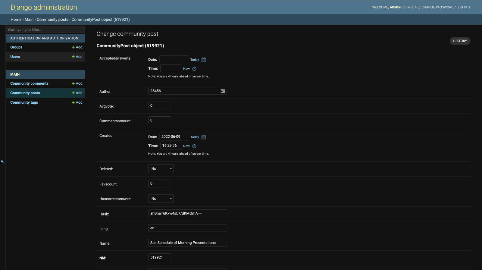 class CommunityPost(models.Model): acceptedanswerts = models.DateTimeField(db_column='AcceptedAnswerTS', blank=True, null=True) # Nom du champ en minuscules. author = models.CharField(db_column='Author', max_length=50, blank=True, null=True) # Nom du champ en minuscules. avgvote = models.IntegerField(db_column='AvgVote', blank=True, null=True) # Nom du champ en minuscules. commentsamount = models.IntegerField(db_column='CommentsAmount', blank=True, null=True) # Nom du champ en minuscules. created = models.DateTimeField(db_column='Created', blank=True, null=True) # Nom du champ en minuscules. deleted = models.BooleanField(db_column='Deleted', blank=True, null=True) # Nom du champ en minuscules. favscount = models.IntegerField(db_column='FavsCount', blank=True, null=True) # Nom du champ en minuscules. hascorrectanswer = models.BooleanField(db_column='HasCorrectAnswer', blank=True, null=True) # Nom du champ en minuscules. hash = models.CharField(db_column='Hash', max_length=50, blank=True, null=True) # Nom du champ en minuscules. lang = models.CharField(db_column='Lang', max_length=50, blank=True, null=True) # Nom du champ en minuscules. name = models.CharField(db_column='Name', max_length=250, blank=True, null=True) # Nom du champ en minuscules. nid = models.IntegerField(db_column='Nid', primary_key=True) # Nom du champ en minuscules. posttype = models.CharField(db_column='PostType', max_length=50, blank=True, null=True) # Nom du champ en minuscules. published = models.BooleanField(db_column='Published', blank=True, null=True) # Nom du champ en minuscules. publisheddate = models.DateTimeField(db_column='PublishedDate', blank=True, null=True) # Nom du champ en minuscules. subscount = models.IntegerField(db_column='SubsCount', blank=True, null=True) # Nom du champ en minuscules. tags = models.CharField(db_column='Tags', max_length=350, blank=True, null=True) # Nom du champ en minuscules. text = models.TextField(db_column='Text', blank=True, null=True) # Nom du champ en minuscules. translated = models.BooleanField(db_column='Translated', blank=True, null=True) # Nom du champ en minuscules. type = models.CharField(db_column='Type', max_length=50, blank=True, null=True) # Nom du champ en minuscules. views = models.IntegerField(db_column='Views', blank=True, null=True) # Nom du champ en minuscules. votesamount = models.IntegerField(db_column='VotesAmount', blank=True, null=True) # Nom du champ en minuscules. class Meta: managed = False db_table = 'community.post' class CommunityComment(models.Model): id1 = models.CharField(db_column='ID1', primary_key=True, max_length=62) # Nom du champ en minuscules. acceptedanswerts = models.DateTimeField(db_column='AcceptedAnswerTS', blank=True, null=True) # Nom du champ en minuscules. author = models.CharField(db_column='Author', max_length=50, blank=True, null=True) # Nom du champ en minuscules. avgvote = models.IntegerField(db_column='AvgVote', blank=True, null=True) # Nom du champ en minuscules. correct = models.BooleanField(db_column='Correct', blank=True, null=True) # Nom du champ en minuscules. created = models.DateTimeField(db_column='Created', blank=True, null=True) # Nom du champ en minuscules. hash = models.CharField(db_column='Hash', max_length=50, blank=True, null=True) # Nom du champ en minuscules. id = models.IntegerField(db_column='Id') # Nom du champ en minuscules. post = models.CharField(db_column='Post', max_length=50, blank=True, null=True) # Nom du champ en minuscules. text = models.TextField(db_column='Text', blank=True, null=True) # Nom du champ en minuscules. texthash = models.CharField(db_column='TextHash', max_length=50, blank=True, null=True) # Nom du champ en minuscules. type = models.CharField(db_column='Type', max_length=50) # Nom du champ en minuscules. votesamount = models.IntegerField(db_column='VotesAmount', blank=True, null=True) # Nom du champ en minuscules. class Meta: managed = False db_table = 'community.comment' unique_together = (('type', 'id'),)