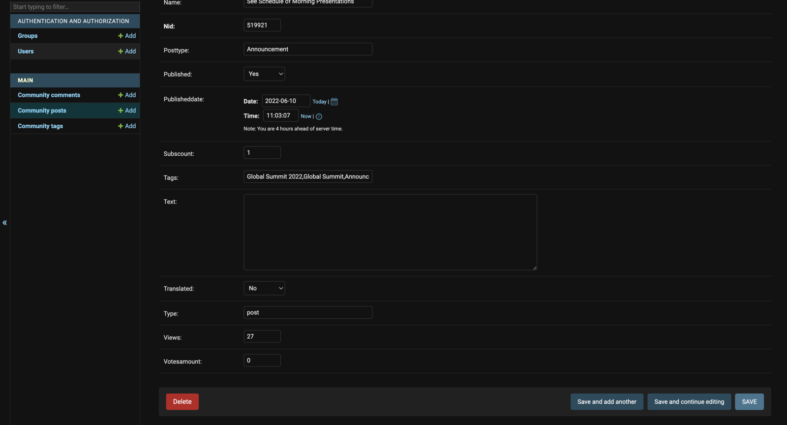 Vous pouvez même plonger dans l'objet, et Django affichera le formulaire, avec les types de champs corrects. ( remarque : Cet ensemble de données ne contient pas de données dans le champ Texte)