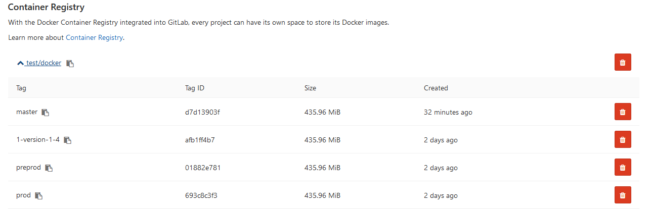 où $CI_COMMIT_REF_NAME est le nom de la branche courante. Notez que la première partie de la balise de l'image doit être nommée de la même manière que le nom du projet dans GitLab, de manière à ce qu'elle puisse être vue dans l'onglet Registre de GitLab (les instructions sur le balisage sont disponibles dans l'onglet Registre).