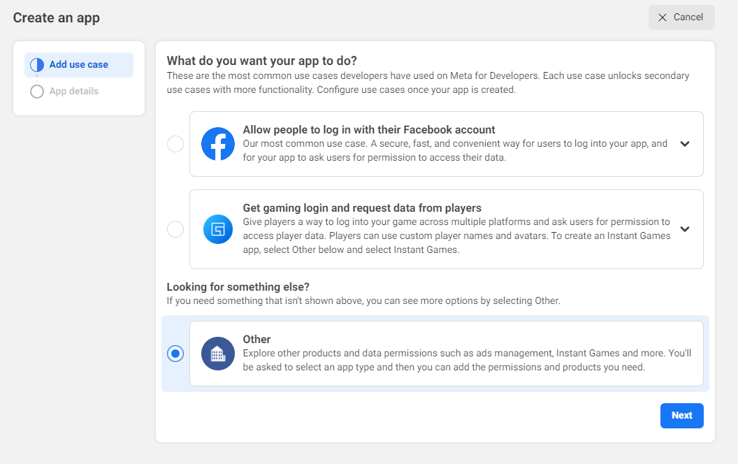 En suivant les instructions de la documentation, nous sélectionnons un type d'application « Other » :