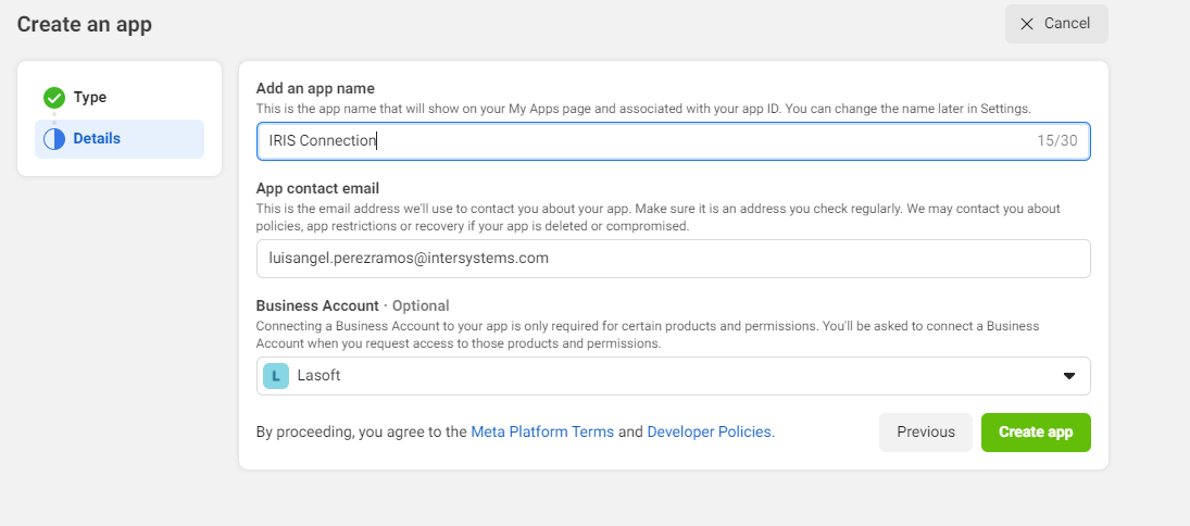 Dans la dernière étape, nous attribuerons le nom de l'application et la lierons à notre compte professionnel pour pouvoir utiliser les fonctionnalités de WhatsApp.