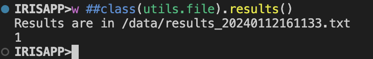 Parameter DIRECTORY = "/data/";Parameter FILENAME = "results";Parameter EXTENSION = ".txt";/// Redirect standard output to a fileClassMethod results() As%Status