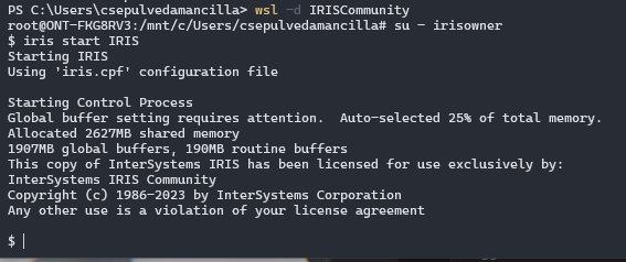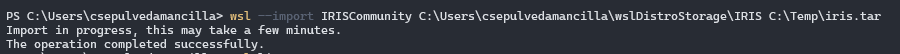 Utiliser la commande wsl -d IRISCommunity pour exécuter votre distribution Linux nouvellement importée.
