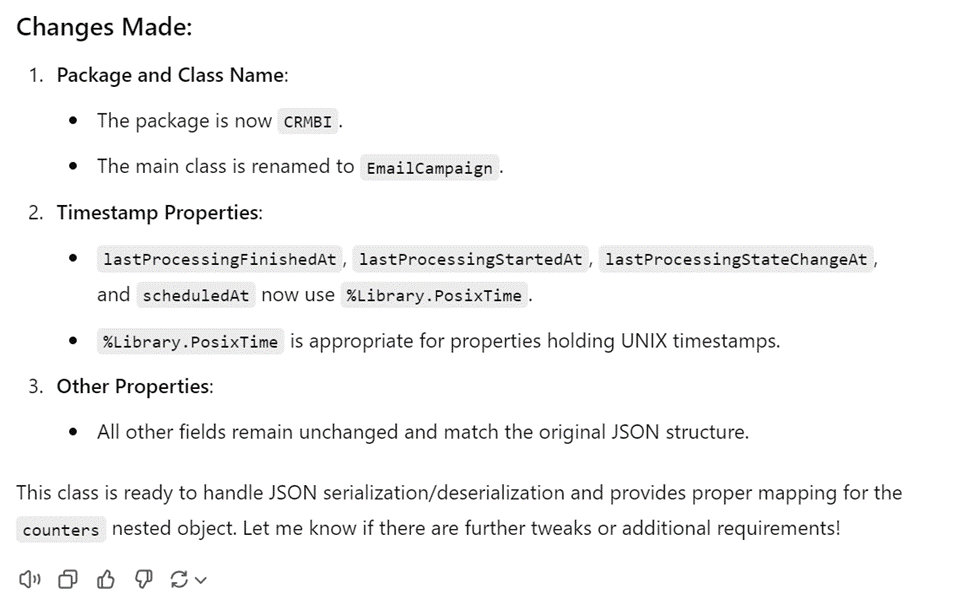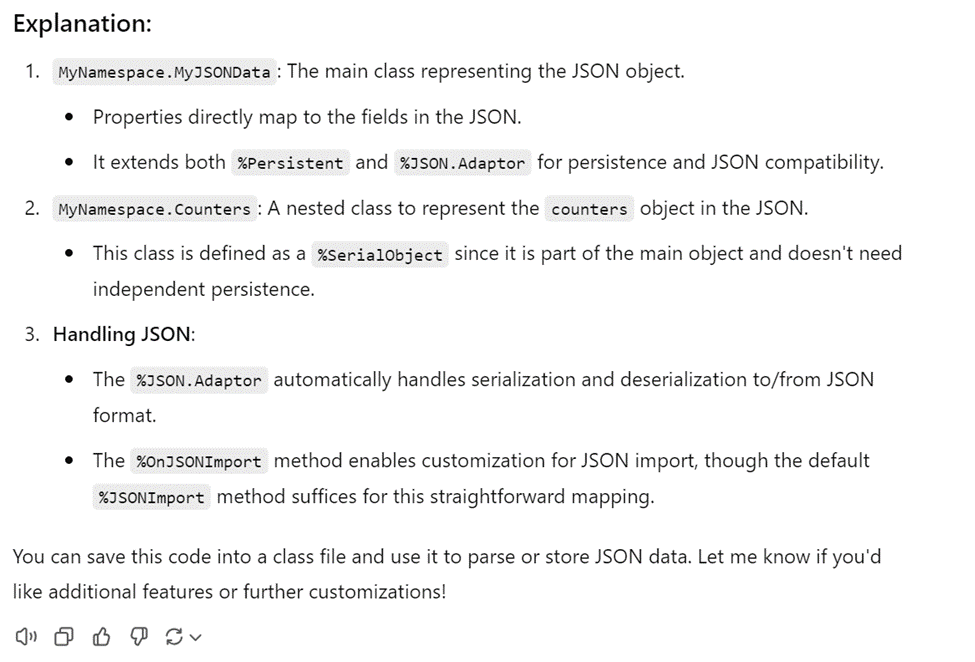ChatGPT: Veuillez fournir la structure JSON pour laquelle vous souhaitez que je génère la classe ObjectScript. Si vous avez un exemple d'objet JSON, collez-le ici et je créerai pour vous la classe ObjectScript InterSystems correspondante.