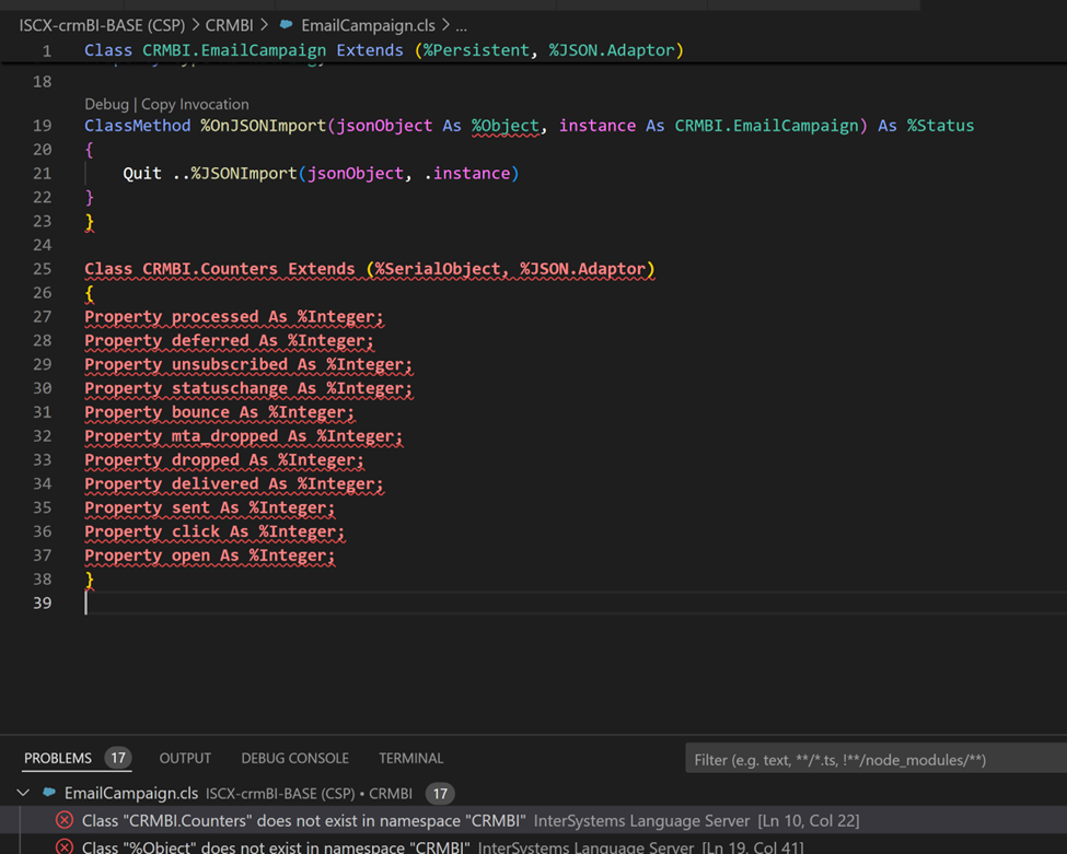 Après avoir supprimé la propriété "As %Object" pour le premier paramètre de %OnJSONImport() dans la première classe et avoir séparé les deux classes dans des fichiers distincts, la classe MyPkg.EmailCampaign s'est compilée avec succès. Cependant, la classe MyPkg.CampaignCounters ne s'est pas compilée ; ChatGPT ne sait pas (pour l'instant ?) que l'underscore est un caractère spécial en ObjectScript (l'opérateur de concaténation de chaînes de caractères).