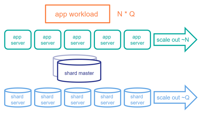 En simplifiant grossièrement, considérons les composants suivants dans une charge de travail d'application : N représente la charge de travail de l'utilisateur et Q représente la taille de la requête. Dans nos exemples précédents, la première charge de travail a un N élevé mais un Q faible et la seconde est caractérisée par un N faible mais un Q élevé. Les serveurs d'application ECP sont très efficaces pour aider à supporter un grand N, car ils permettent de répartir les utilisateurs de l'application sur différents serveurs. Cependant, ils ne sont pas nécessairement aussi utiles si l'ensemble de données devient très grand et que l'ensemble de travail ne tient pas dans la mémoire d'une seule machine. Le sharding s'occupe des grands Q, en vous permettant de partitionner l'ensemble de données entre les serveurs, le travail étant également poussé vers ces serveurs shard autant que possible.