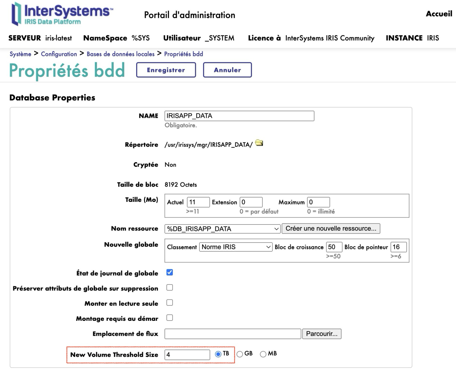 À mesure que les bases de données clients se développent, les fichiers de bases de données évoluent également. Pour éviter que ces fichiers ne deviennent trop volumineux ou n'atteignent les limites strictes du système de fichiers, InterSystems IRIS prend désormais en charge la division transparente de votre base de données sur plusieurs « volumes » physiques. Cette nouvelle fonctionnalité se configure facilement : pour n'importe quelle base de données, vous pouvez désormais configurer une taille de seuil. Lorsque votre fichier IRIS.DAT initial est sur le point d'atteindre cette taille et que de nouvelles données globales doivent être écrites, InterSystems IRIS créera de manière transparente un nouveau fichier « volume de base de données » et commencera à écrire de nouvelles données dans ce fichier. Lorsque ce volume atteint le seuil, un autre fichier est créé, et ainsi de suite.
