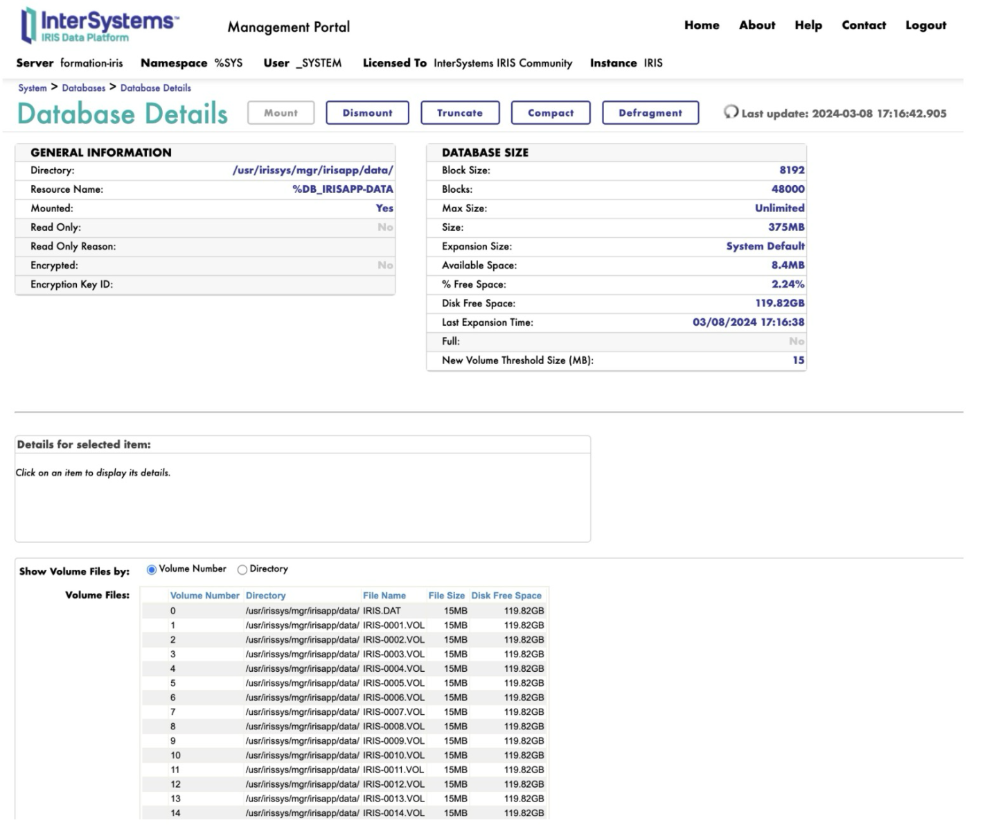 Le portail  System > Databases > Database Details permet de voir les différents volumes créés ; ici avec un seuil à 15Mo :