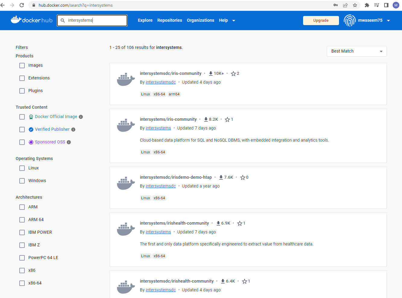 En utilisant la fonction de recherche Docker Hub, nous pouvons trouver des images InterSystems sur Docker Hub.