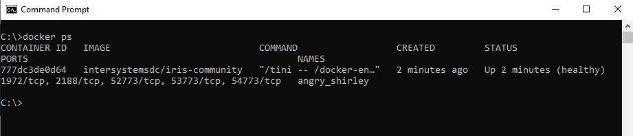 Nous pouvons voir que notre conteneur de l'image IRIS en édition communautaire est maintenant en cours d'exécution.