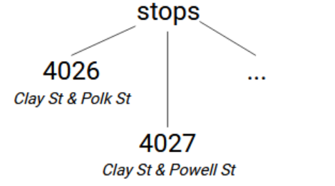 Commençons par le fichier stops.txt, qui contient tous les arrêts de transport public de la ville. Dans ce fichier, nous n'utiliserons que les colonnes stop_id et stop_name. Nous allons les stocker dans une globale nommée stops une structure arborescente avec une couche de nœuds, avec les ID des arrêts comme indices et le nom des arrêts comme valeurs des nœuds. Notre structure ressemble donc à stops → [stop_id]=[stop_name]. (Pour cet article, j'utiliserai des crochets pour indiquer quand un indice n'est pas littéral, mais plutôt une valeur lue dans les fichiers de données.)