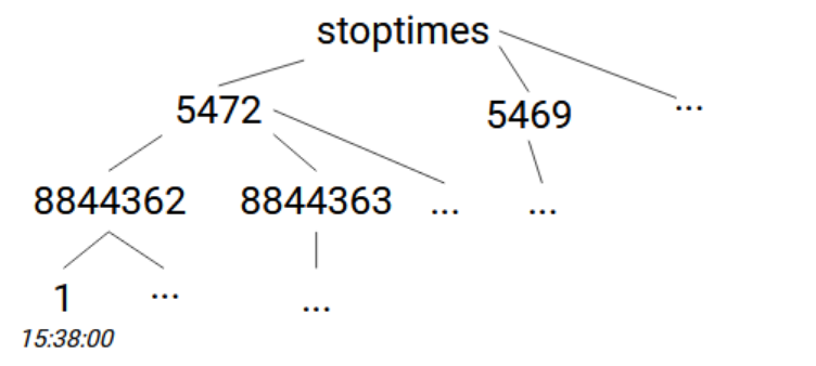 À ce stade, nous pouvons trouver les heures d'arrêt. Le sous-arbre stoptimes -> [stop_id] contient les ID des trajets en tant que sous-nœuds, qui contiennent les temps d'arrêt en tant que sous-nœuds. Nous ne sommes pas intéressés par les ID de trajet - seulement par les temps d'arrêt - donc nous allons itérer sur tous les ID de trajet et collecter tous les temps d'arrêt pour chacun d'eux.