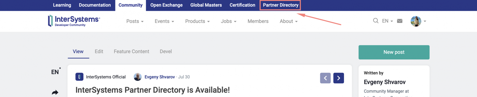 Vous trouverez facilement le site de l'annuaire des partenaires InterSystems dans la barre supérieure :