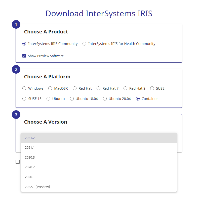 Pour les Clients et les Employés d'InterSystems - activez simplement la case à cocher Preview et cela inclura le logiciel d'aperçu dans le menu déroulant pour la version disponible :