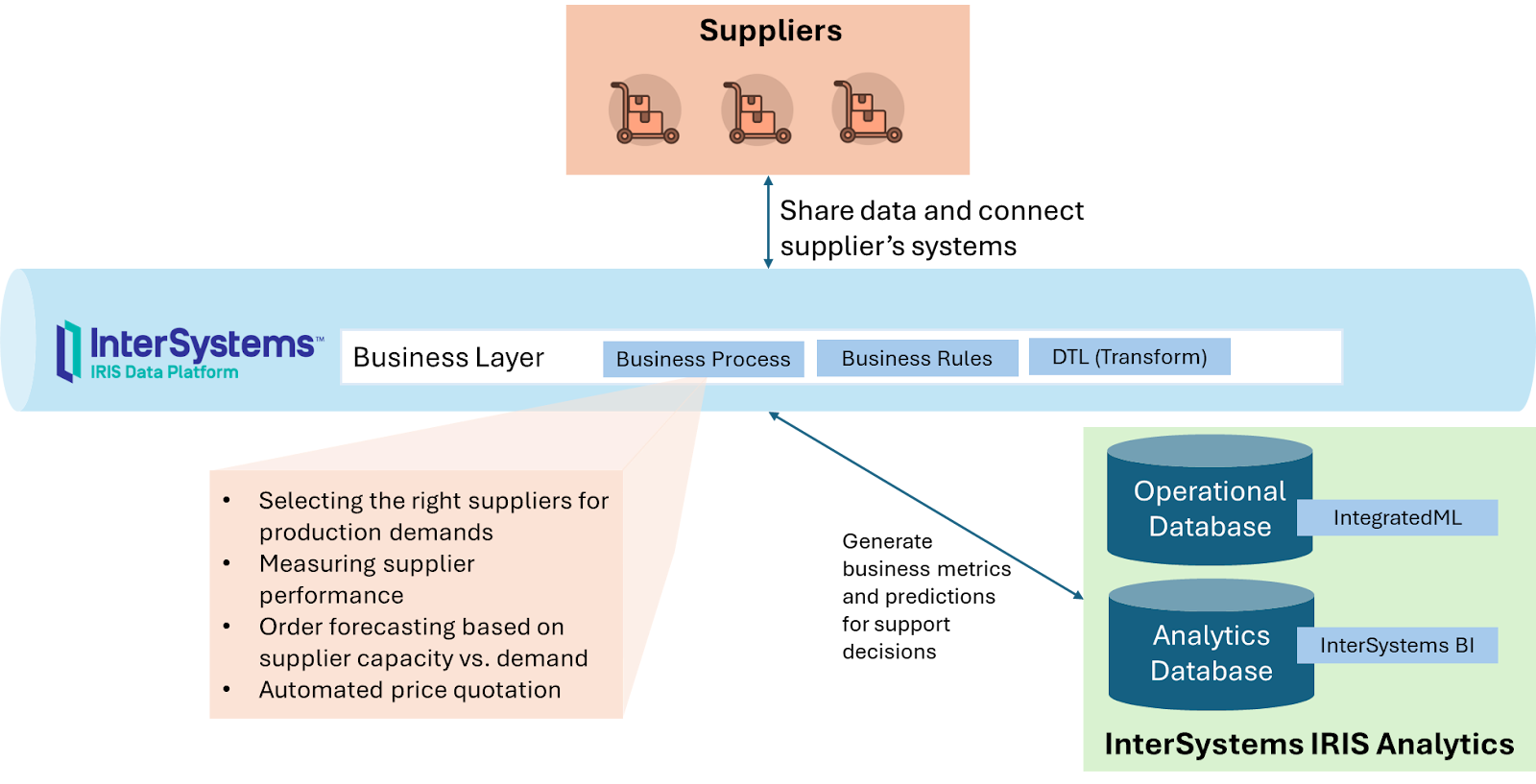 Tous les processus de la chaîne logistique exigent une planification rigoureuse, toujours étayée par les données et les analyses nécessaires pour planifier et exécuter les activités dans le respect des critères de qualité, de précision, de rapidité et d'économie dans l'acquisition des matières premières, la production, le stockage, la livraison (logistique) et, si nécessaire, le renvoi (logistique inverse ou reverse logistic) des produits au consommateur final. InterSystems IRIS peut prendre en charge la planification de la chaîne logistique au moyen de ses fonctionnalités d'interopérabilité, de base de données et d'analyse: