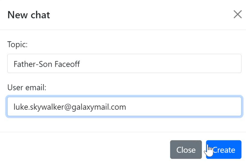 Pour le moment, il est possible de créer un salon de discussion avec 2 personnes. Pour le créer, il est nécessaire de spécifier le sujet du salon de discussion et l'adresse e-mail de l'utilisateur inscrit :