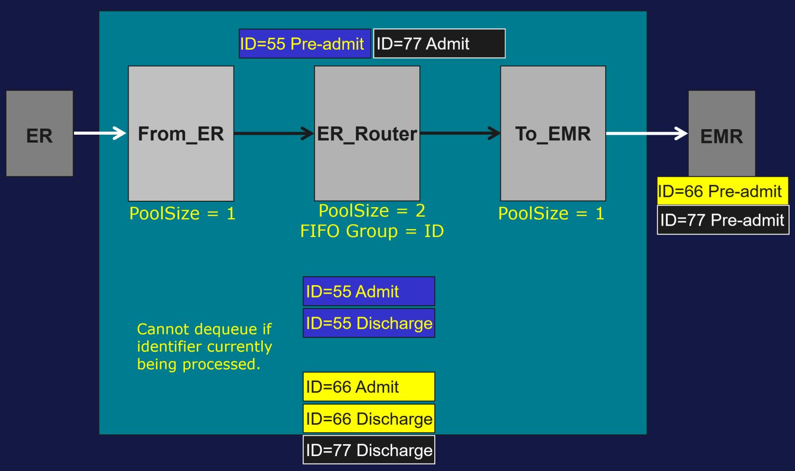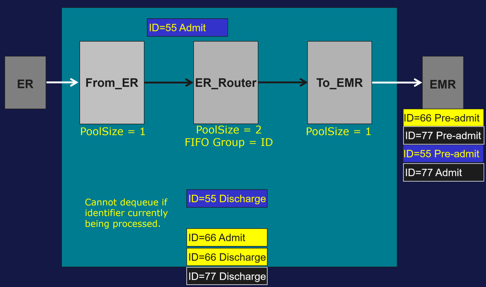 Exemple : traitement simultané des messages pour les patients 55, 66 et 77 avec un Pool Size = 2.
