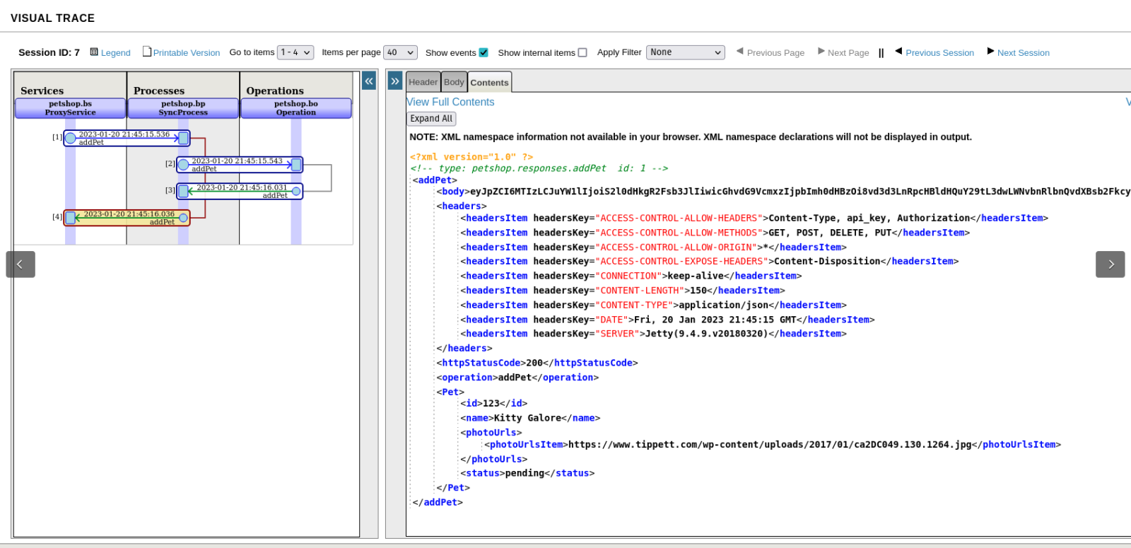 Do messageResponse.Pet.%JSONExport()Maintenant, vous pouvez ouvrir la trace visuelle et voir les détails: