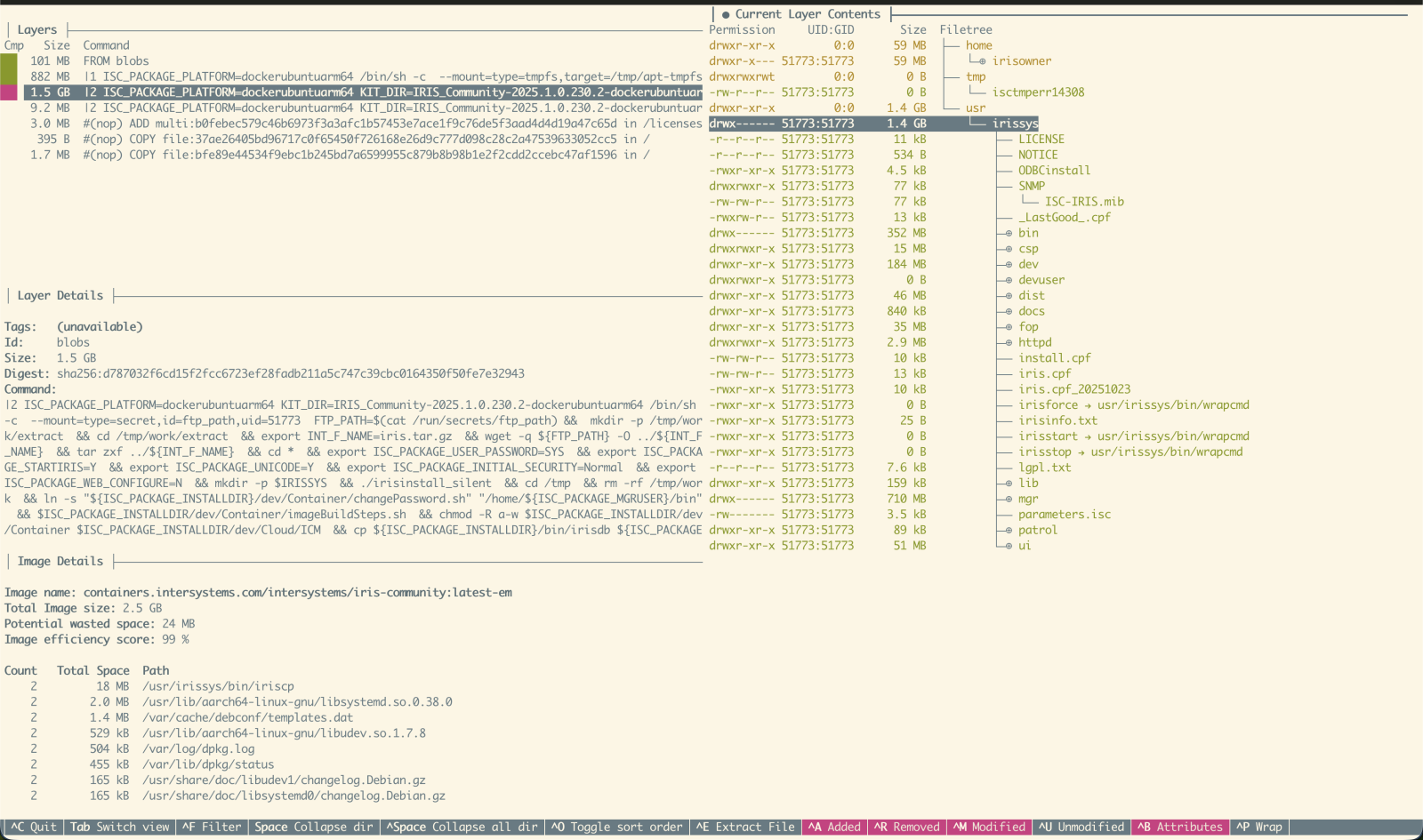 Pour comprendre et optimiser l'image IRIS Community Edition, nous avons utilisé dive, un outil d'inspection des couches d'images Docker et d'identification des inefficacités.