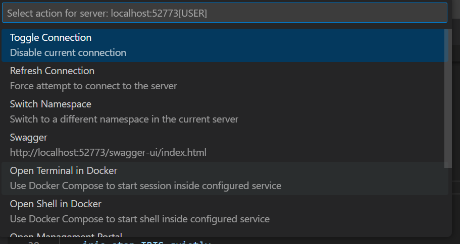 5. Ouvrez le code source sur VSCode (installez ObjectScript et les extensions InterSystems si vous ne les avez pas encore) et Choizissez en bas docker:iris52773[USER] pour ouvrir les options :